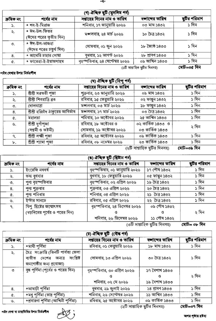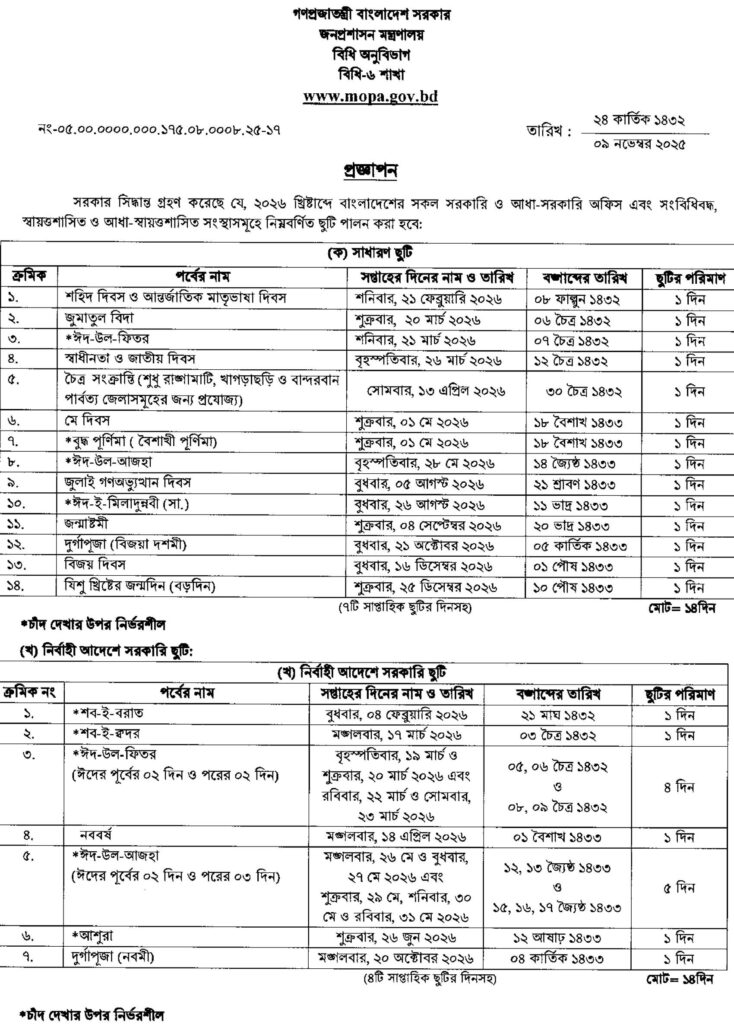 Bangladesh Government Holiday Calendar 2026 | সরকারি ছুটির তালিকা